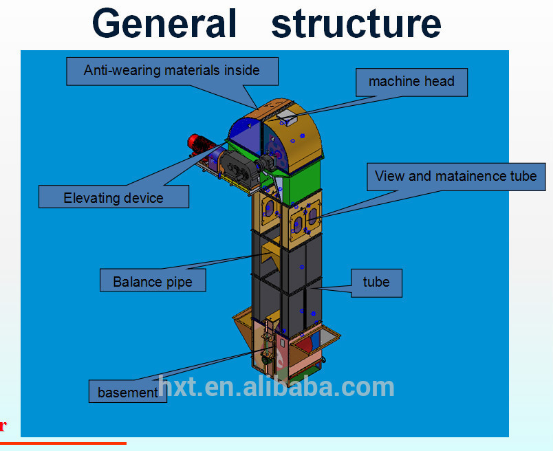 頭輪覆膠、防逆轉(zhuǎn),機(jī)頭內(nèi)襯耐磨高分子板,機(jī)筒采用咬合工藝強(qiáng)度高,國(guó)產(chǎn)電機(jī)及減速機(jī), 高強(qiáng)尼龍畚斗帶、高強(qiáng)塑料畚斗,噴漆。高度為設(shè)備總高。